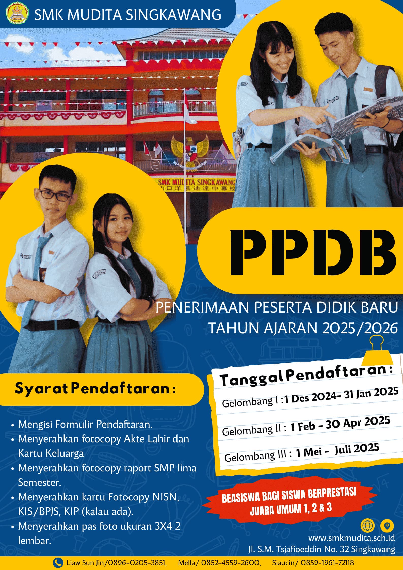 Penerimaan peserta didik baru tahun ajaran 2025/2026 dibuka mulai 1 Desember 2024 hingga bulan Juli 2025 pantau terus update terbaru mengenai PPDB SMK MUDITA SINGKAWANG FB: Smks Mudita Singkawang IG: muditaofficial.id YT: SMK Mudita Singkawang Official